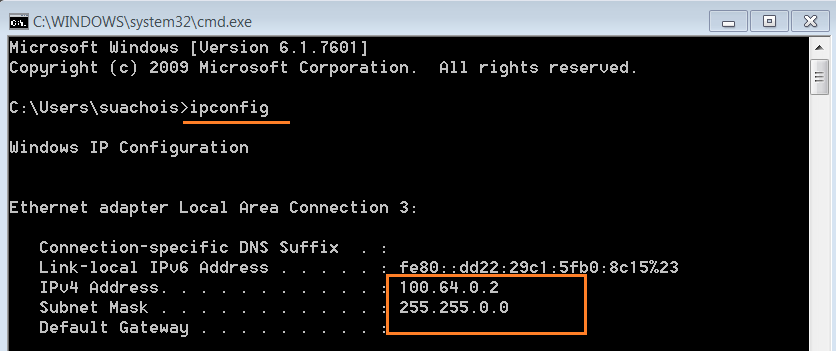 2) จะปรากฎหน้าต่างสีดำ จากนั้นให้พิมพ์คำว่า ipconfig แล้วกด enter ซึ่งก็จะปรากฏกลุ่มหมายเลข IP Address ให้เห็นดังรูป