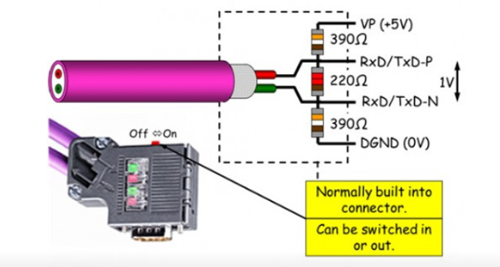 PROFIBUS Connrctor ทุกตัวจะมีสวิตช์เล็กๆอยู่ด้วยเสมอเพื่อใช้ตัดต่อตัวความต้านทาน หรือ Terminating Resistor *** Terminating Resistor ทำหน้าที่ระบุจุดหรือโหนด (Node) หรืออุปกรณ์ตัวสุดท้ายของ ProfiBus Network |