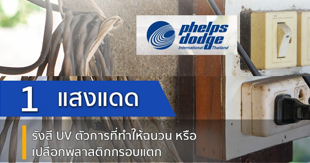 ....รังสี UVในแสงแดดเป็นตัวการสำคัญที่ทำให้ฉนวนหรือเปลือกพลาสติกกรอบแตก สายไฟฟ้าที่ใช้ในอาคารเช่น สาย VAF หรือสาย 60227 IEC 01 (THW) ที่ไม่ใช่สีดำ โดยทั่วไปจะไม่มีคุณสมบัติป้องกันรังสี UV ดังนั้นหากนำไปติดตั้งภายนอกอาคารหรือติดตั้งในที่แสงแดดส่องถึงเป็นเวลานาน อายุการใช้งานสายจะสั้นกว่าสายที่ไม่ถูกแสงแดด