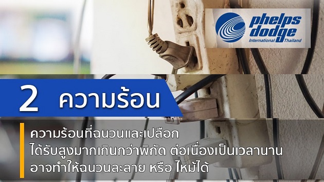 ...ความร้อนที่ฉนวนและเปลือกได้รับสูงเกินกว่าพิกัดต่อเนื่องเป็นเวลานาน ส่งผลให้พลาสติกสูญเสียสภาพความยืดหยุ่นและความเป็นฉนวนได้ และถ้าความร้อนสูงมากอาจทำให้ฉนวนละลายหรือไหม้ได้ ซึ่งความร้อนอาจเกิดจากสภาพแวดล้อมที่ติดตั้งสายหรืออาจเกิดจากกระแสไฟฟ้าที่ไหลในสายสูงเกินพิกัด