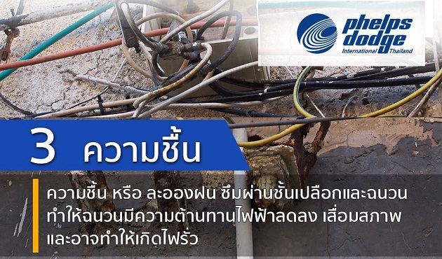 ....ความชื้นเป็นอีกหนึ่งปัจจัยที่ส่งผลต่อการเสื่อมสภาพของสายไฟฟ้าในระยะยาว โดยเฉพาะจุดต่อสายที่ไม่มีฉนวนหุ้มที่ติดตั้งในที่ซึ่งมีโอกาสที่ละอองฝนหรือความชื้นสามารถเข้าไปถึงตัวนำทองแดงจนทำให้เกิดสนิมหรือเกิดการกัดกร่อนได้ นอกจากนี้ สายที่ติดตั้งในที่ชื้นแฉะหรือแช่ในน้ำตลอดเวลาจะมีโอกาสที่น้ำจะซึมผ่านชั้นเปลือกและฉนวนเข้าไปถึงภายในสาย ทำให้ฉนวนมีความต้านทานไฟฟ้าลดลงและสูญเสียสภาพความเป็นฉนวนจนเกิดไฟรั่วได้