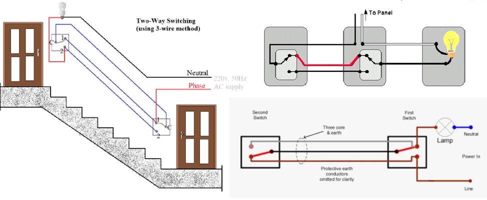 สวิตช์สองทางคือการควบคุมไฟฟ้าหรือแสงสว่างที่เราสามารถควบคุมได้จากสองจุดหรือ สามารถ “ปิดและเปิด” ได้จากทั้งสองตำแหน่ง ตัวอย่างเช่น: