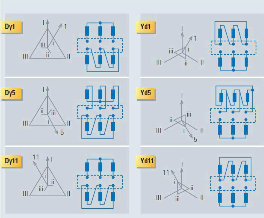 การใช้ตัวอักษร D , d , Y หรือ y นั้น จะกำหนดตามการต่อเชื่อมขดลวด 3 เฟสให้เป็น Delta หรือ Star(Y) ขดลวดด้านแรงสูงจะใช้สัญญลักณ์อักษรตัวใหญ่ เช่น D หรือ Y ส่วนขดแรงต่ำใช้อักษรตัวเล็กเช่น d หรือ y