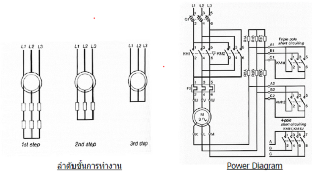 จากรูปตัวอย่างแบบ 3 สเต็ป....ที่วงจรเมนหรือเพาเวอร์หรือวงจรจ่ายไฟให้กับมอเตอร์จะมีประกอบด้วยคอนแทคเตอร์ 2 ตัวคือ KM1 และ KM2