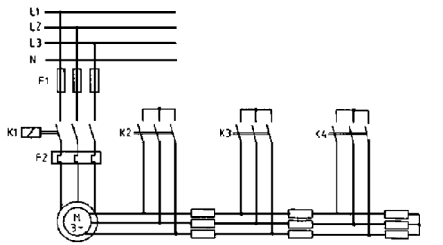 โดยที่ KM1 จะควบคุมให้มอเตอร์หมุนตามปกติ ส่วน KM2 จะสลับเฟสระหว่าง L1 กับ  L3 เพื่อใช้ในกรณีที่ต้องการกลับทางหมุนมอเตอร์ (โดยทั้งสองจะมี interlock ซึ่งกันและกันเพื่อป้องกันการทำงานพร้อมกัน)   ส่วนวงจรของโรเตอร์ จะมีคอนแทคเตอร์ 2 ตัว สุด KM11  และ KM2