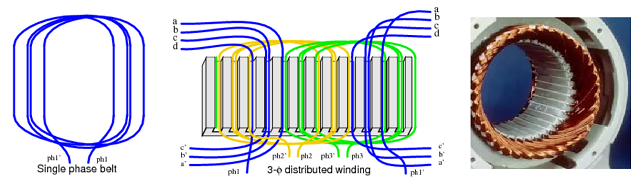 ซ้ายมือ:ตัวอย่างการพันขดลวดสเตเตอร์ของมอเตอร์ 3 เฟส แบบที่เป็นชนิด 2 ขั้วแม่เหล็ก