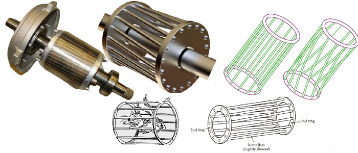 สำหรับโครงสร้างของโรเตอร์ชนิดนี้ จะประกอบไปด้แท่งอลูมิเนียม หรือ อลูมิเนียม บาร์ (aluminum bar) ฝังอยู่ในแผ่นเหล็กลามิเนต และมิการเชื่อมต่อหัวท้ายให้ติดกันซึ่งมีรูปร่างคล้ายกับกรงกระรอก ดังตัวอย่าง