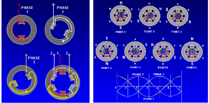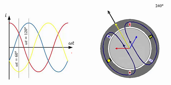 ขวามือ : แสดงการเกิดผลรวมของเส้นแรงแม่เหล็กหรือเส้นแรงแม่เหล็กลัพธ์ ซึ่งทำให้เกิดแกนกลางของขั้วแม่เหล็ก และทำให้มีขั้วเหนือและขั้วใต้หมุนเปลี่ยนแปลงตามเวลาแปรผันไปตามรูปคลื่นไซน์ของแรงดันไฟฟ้าที่จ่ายเข้าไปยังขดลวด (ตัวอย่างมอเตอร์ที่เป็นชนิด 2 ขั้วแม่เหล็ก)