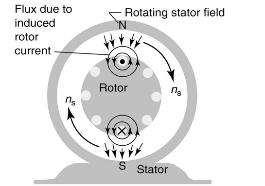 หลังจากป้อนไฟเข้าขดลวดสเตเตอร์แล้ว ก็จะทำให้เกิดสนามแม่เหล็กหมุนและหมุนด้วยเร็วเท่ากับความเร็วซิงโครนัสสปีดดังที่อธิบายมาแล้วด้านบน ...จากนั้นก็จะทำให้เกิดปรากฏการณ์ที่เรียกว่าสนามแม่เหล็กหมุนก็จะวิ่งตัดกับตัวนำ (แท่งอลูมิเนียมหรืออลูมิเนียมบาร์ที่ฝังอยู่ในแกนเหล็กในตัวโรเตอร์) ซึ่งก็จะให้เกิดการเหนี่ยวขึ้นในโรเตอร์