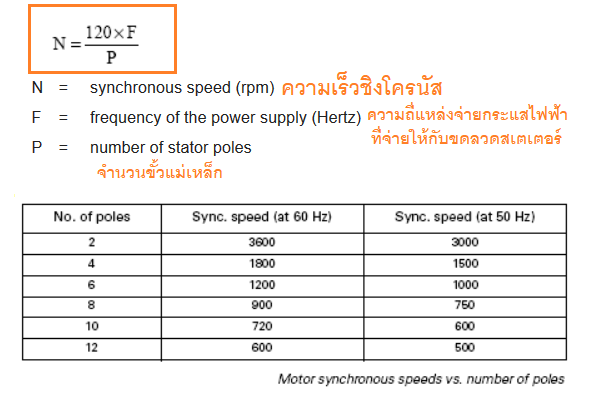 *** F คือความถี่ของกระแสไฟฟ้า 50 หรือ 60 เฮิร์ท ส่วน P คือจำนวนข้ัวแม่เหล็กที่เกิดจากการพันขดลวดที่สเตอร์ ซึ่งมีจำนวนเป็นเลขคู่ 2,4,6,8,10 หรือ 12 ขั้ว ขึ้นที่กับการออกแบบ