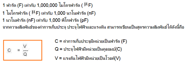 ค่าความจุของตัวเก็บประจุหมายถึงความสามารถในการเก็บประจุไฟฟ้าซึ่งมีหน่วยเป็นฟารัด (Farad) เขียนแทนด้วยอักษรภาษาอังกฤษด้วยตัวเอฟ(F)