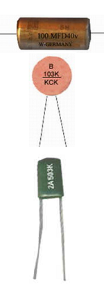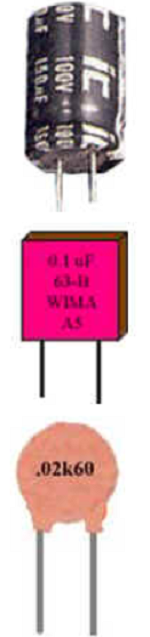 - ตัวเก็บประจุโพลี Polyester capacitorตัวเก็บประจุชนิดนี้อาจแบ่งได้หลายแบบเช่น โพลีเอสเตอร์ โพลีคาร์บอนเนต โพลีโพไฟลีน ค่าความจุจะอยู่ในช่วง นาโน - ไมโคร เช่นเดียวกับ ตัวเก็บประจุไมล่าการใช้งานแรงดัน อยู่ในช่วง 50V - 100 V หรือมากกว่า ซึ่งจะเขียนติดไว้ที่ตัวเก็บประจุอยู่แล้วและค่าตัวเก็บประจุ จะพิมพ์อยู่บนตัวเก็บประจุเลย โดยอาจจะเป็นค่า pF หรือ uF ขึ้นอยู่กับค่าความจุในการใช้งานส่วนมากจะใช้งานในระบบเสียง เสียงเครื่องเสียง ระบบความคุม เป็นต้น
