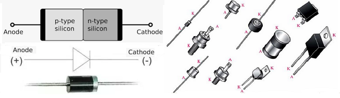 ไดโอดประกอบด้วยขั้ว 2 ขั้ว คือ แอโนด (Anode ; A) ซึ่งต่ออยู่กับสารกึ่งตัวนำชนิด p และ แคโธด (Cathode ; K) ซึ่งต่ออยู่กับสารกึ่งตัวนำชนิด n ดังรูป