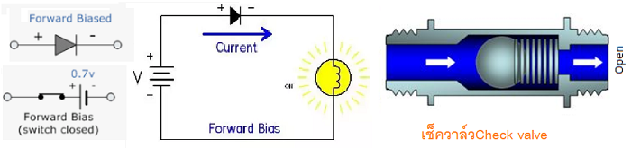 การต่อไบแอสตามให้กับไดโอดจะทำให้มีกระแสไหลผ่านตัวไดโอดได้ง่ายเหมือนกับไดโอดตัวนั้นเป็นสวิตซ์อยู่ในลักษณะต่อทำให้สารกึ่งตัวนำประเภทพีและสารกึ่งตัวนำประเภทเอ็นมีค่าความต้านทานต่ำ กระแสไฟจึงไหลผ่านไดโอดได้