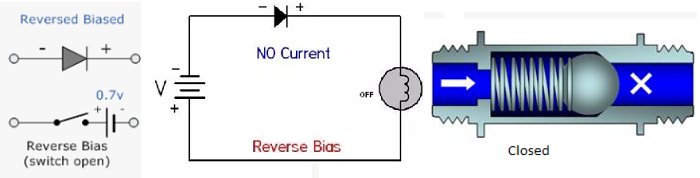 2. การไบแอสอุปกรณ์ไดโอดย้อนกลับ หรือที่เรียกว่า Reverse Bias ซึ่งการไบแอสในลักษณะนี้จะเป็นการกำหนดให้ขั้ว A (Anode) ที่มีลักษณะของสารเป็นสาร P มีค่าของแรงดันน้อยกว่าขั้ว K (Cathode) ที่มีลักษณะของสารเป็นสาร N ซึ่งจากลักษณะดังกล่าวนี้ก็จะทำให้ไดโอดนั้นไม่สามารถที่จะนำกระแสได้ และจากลักษณะของการไบแอสนี้นั้นมันก็จะเป็นลักษณะการทำงานของอุปกรณ์ไดโอดในทางอุดมคติ (Ideal Diode) อีกอย่างหนึ่งนะครับ ดังแสดงในรูป