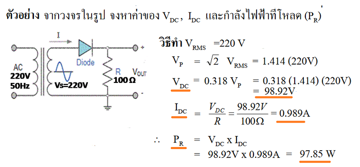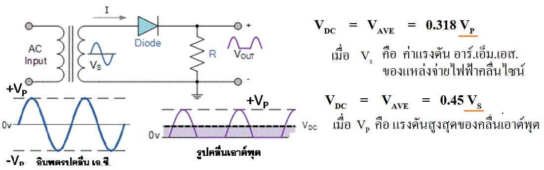 รูปแสดงลักษณะของรูปคลื่นทางด้านเอาท์พุตและค่าแรงดันเฉลี่ยของแรงดันเอาท์พุทของวงจรเรียงกระแสแบบครึ่งคลื่น