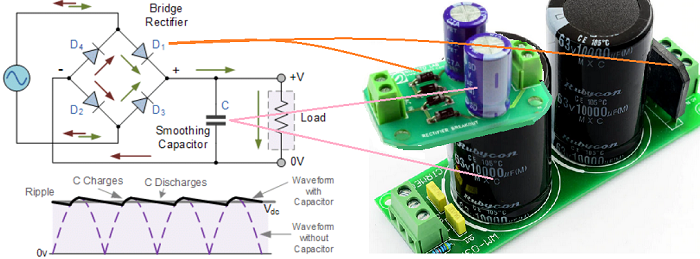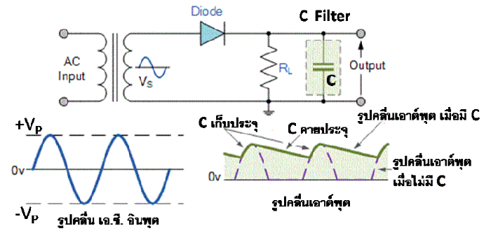 การเก็บประจุและคายประจุของ C ตัวนี้ จะทำให้รูปคลื่นเอาต์พุตเรียบขึ้น จึงเรียกตัวเก็บประจุ (C) ที่ทำหน้าที่นี้ว่า SmoothingCapacitor หรือ Filter Capacitor