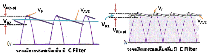รูปแสดงการเปรียบเทียบ แรงดันริปเปิลของการเรียงกระแสครึ่งคลื่นและเต็มคลื่น