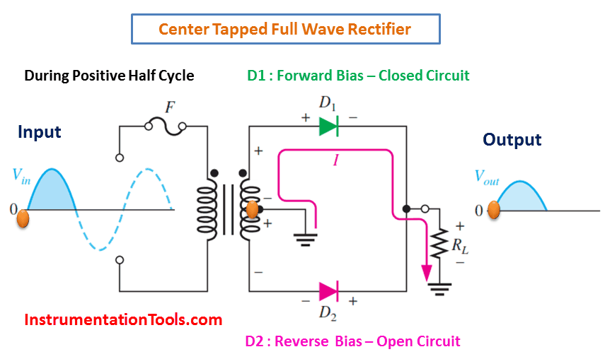 การทำงานของวงจรเมื่อขั้วบนของขดทุติยภูมิมีค่าแรงดันเป็นบวก ขั้วล่างมีแรงดันเป็นลบไดโอด D1 จะได้รับไบอัสตรง นำกระแสมีกระแสไหลผ่านไดโอดผ่านโหลด RL ไปครบวงจรที่ขั้วแท็ป ทำให้เกิดแรงดันตกคร่อมที่โหลด RL เป็นคลื่นรูปไซน์ครึ่งคลื่น