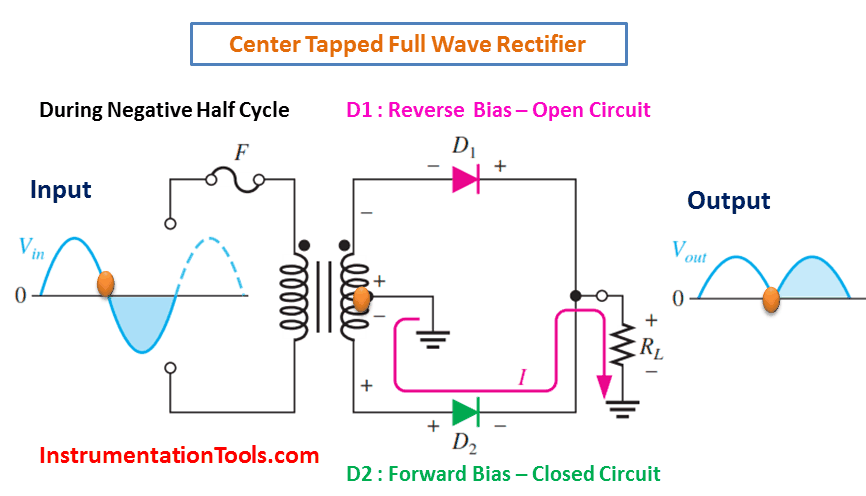 ในช่วงเวลาต่อมา ขั้วบนของขดทุติยภูมิมีค่าแรงดันเป็นลบ ขั้วล่างมีค่าแรงดันเป็นบวก ไดโอด D1 จะได้รับไบอัสกลับ ไดโอด D2 ได้รับไบอัสตรงเกิดการนำกระแส มีกระแสไหลผ่านไดโอดผ่านโหลด RL ไปครบวงจรที่ขั้วแท็ปทำให้เกิดแรงดันตกคร่อมที่โหลด RL เป็นคลื่นรูปไซน์ครึ่งคลื่นด้านบวกปรากฏที่เอาท์พุท