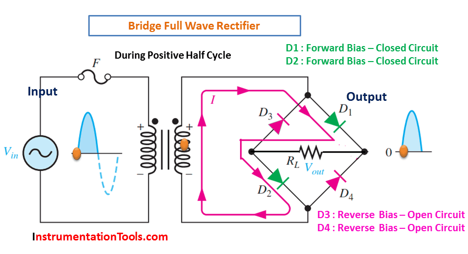 วงจรเรียงกระแสเต็มคลื่นนี้ จะสามารถเรียงแรงดันไฟสลับให้ออกเอาท์พุทได้ทั้งช่วงบวกและช่วงลบของแรงดันไฟสลับที่ป้อนเข้ามาที่อินพุทของวงจร โดยไม่มีส่วนใดของแรงดันไฟสลับถูกตัดทิ้งไป