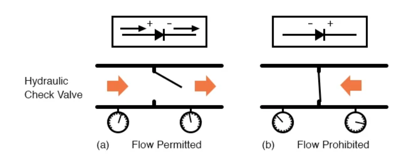 คุณสมบัติของไดโอดหากเปรียบเทียบกับอุปกรณ์ทางกล ก็จะคล้ายๆกันกับเช็ควาล์วในระบบไฮดรอลิกส์ ซึ่งเช็คจะยอมให้น้ำมันไฮดรอลิกส์ไหลได้เพียงแค่ทิศทางเดียว จะไม่ยอมให้น้ำมันไฮดรอลิกส์อีกด้านไหลย้อนกลับด้าน