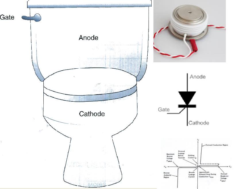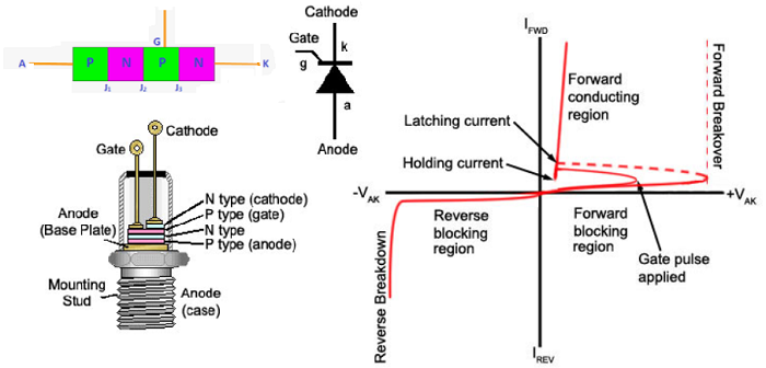 จากรูป จะเห็นว่า เมื่อ SCR จะนำกระแสได้ ก็ต่อเมื่อได้รับการฟอร์เวิร์ดไบอัสด้วยแรงดันระดับหนึ่ง มีการระดุ้นหรือจุดชนวนที่ขาเกต SCR หรืออีกกรณีหนึ่งคือเมื่อมีแรงดันตกคร่อมระหว่าง แอโนดและแแคโธด สูงๆค่าหนึ่งจนกระทั่งถึงระดังแรงดันฟอร์เวิร์ดเบรคดาวน์ SCR ก็จะนำกระแสได้เองโดยไม่ต้องมีการกระตุ้นหรือจุดชนวน