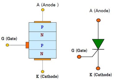 SCR เป็นอุปกรณ์สารกึ่งตัวนำจำพวกไทริสเตอร์ จะมีโครงสร้างประกอบด้วยสารกึ่งตัวนำชนิด P และชนิด N ต่อชนกันทั้งหมด 4 ตอน เป็นสารชนิด P2 ตอน และสารชนิด N 2 ตอน โดยเรียงสลับกัน มีขาต่อออกมาใช้งาน 3 ขา คือ ขาแอโนด (ANODE) ขาแคโถด (CATHODE) และขาเกท (GATE) โครงสร้างและสัญลักษณ์แสดงดังรูป