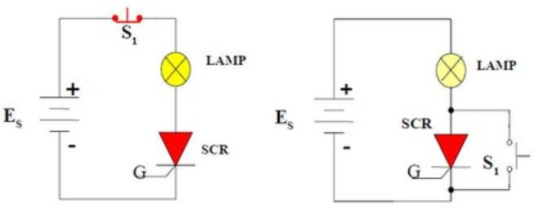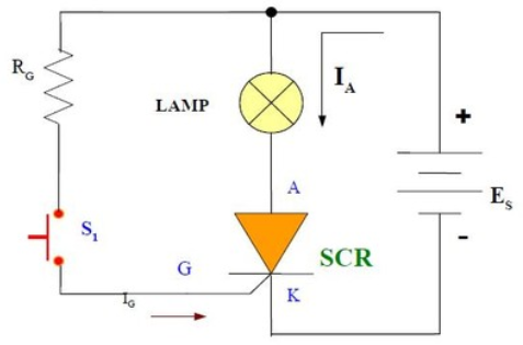 จากรูป - ในขณะที่สวิตช์ S1 อยู่ในสภาวะเปิดวงจรเอสซีอาร์จะไม่นำกระแส เพราะว่าไม่มีกระแสไปจุดชนวนที่ขาเกตของเอสซีอาร์ (IG = 0) แรงดันตกคร่อมขาแอโนดและแคโทดมีค่าสูงมาก กระแส IA จึงไม่สามารถไหลผ่านได้ หลอดไฟจึงไม่ติดหรือถ้าเป็นโหลดอื่นๆก็จะไม่ทำงาน แต่ถ้ามีการกดสวิตช์ S1 หรือมีการจุดชนวน SCR ก็จะทำงาน