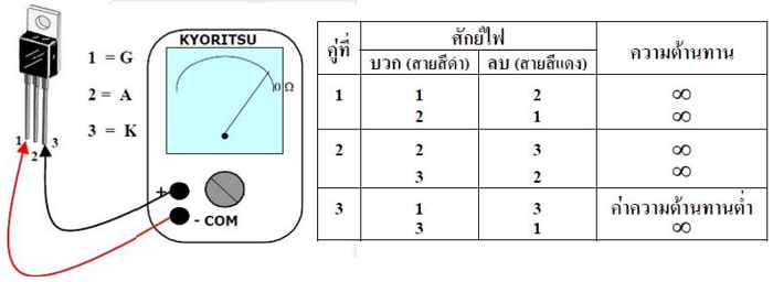 หาร พิจารณาค่าความต้านทานระหว่างขาของเอสซีอาร์จากตารางสรุปได้ว่า การวัดเอสซีอาร์ทั้ง 3 ขา จำนวน 6 ครั้ง สามารถอ่านค่าความต้านทานได้เพียง 1 ครั้งหรือเรียกว่า " วัด 6 ครั้ง เข็มขึ้น 1 ครั้ง " ครั้งที่สามรถอ่านค่าความต้านทานต่ำได้นั้น ศักย์ไฟบวก ( สายสีดำ ) จับที่ขาใดนั้นเป็นขาเกต และศักย์ไฟลบ