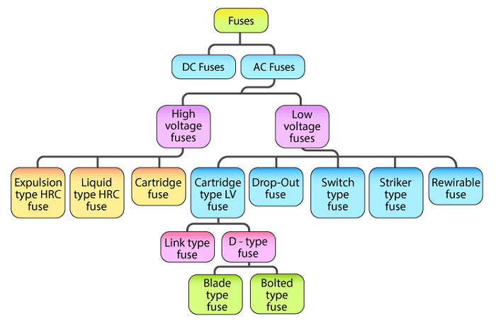 จากรูปด้านบน จะเห็นฟิวส์หากแบ่งชนิดตามลักษณะรูปร่าง ก็จะมีหลายแบบด้วยกัน แต่ถ้าพิจารณาตามฟังก์ชั่นก็จะแยกเป็นแบบ Time-Delay Fuses และ Fast-Acting Fuses ดังต่อไปนี้
