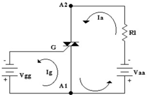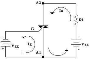 2.สภาวะที่ 2 หรือควอนแดรนด์ที่ 2จ่ายแรงดันบวกให้ขา A2 และจ่ายแรงดันลบให้ขา A1 แต่กระตุ้นหรือทริกที่ขา G ด้วยแรงดันลบ ซึ่งจะเกิดการนำกระแสในตัวไตรแอคดังรูป