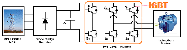 ตัวอย่างวงจรกำลัง (Power Circuit) ของอินเวอร์เตอร์ ที่ใช้ IGBT เป็นสวิตซ์ควบคุมการทำงานแบบ PMW