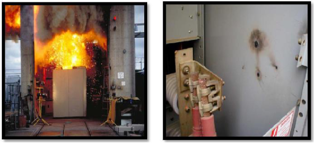 2. โลหะหลอมละลาย อาร์กจากไฟฟ้าแรงสูงสามารถทำให้ชิ้นส่วนอุปกรณ์ไฟฟ้าที่เป็นทองแดง และ อะลูมิเนียมหลอมละลายได้ หยดโลหะหลอมเหลวดังกล่าวอาจถูกแรงระเบิดจากคลื่นความดันผลักให้กระเด็นไปเป็นระยะทางไกลๆ ได้ ถึงแม้ว่าหยดโลหะเหล่านี้จะแข็งตัวอย่างรวดเร็ว แต่ก็ยังมีความร้อนเหลืออยู่มากพอที่จะทำให้เกิดการไหม้อย่างรุนแรง หรือทำให้เสื้อผ้าปกติทั่วไปลุกติดไฟได้ แม้ว่าจะอยู่ห่างจากจุดเกิดเหตุมากกว่า 3 เมตร แล้วก็ตาม ดังนั้นจะต้องดูแลไม่ให้มีวัตถุที่ติดไฟได้อยู่ใกล้ รวมทั้งมีวิธีการป้องกันที่เหมาะสมด้วย