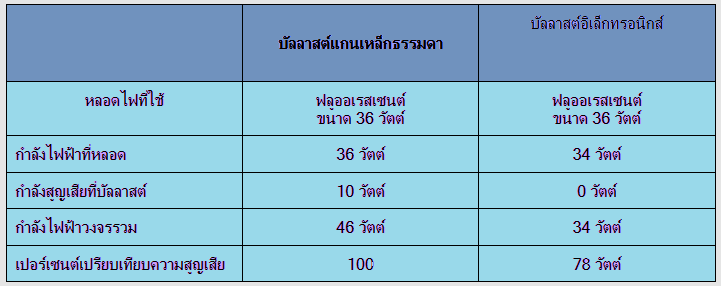 2.ประหยัดไฟของเครื่องปรับอากาศได้ประมาณ 3.3 วัตต์ต่อหลอด เนื่องจากเกิดการสูญเสียที่น้อยกว่า อุณหภูมิขณะทำงานของบัลลาสต์อิเล็กทรอนิกส์ต่ำกว่าบัลลาสต์แกนเหล็ก