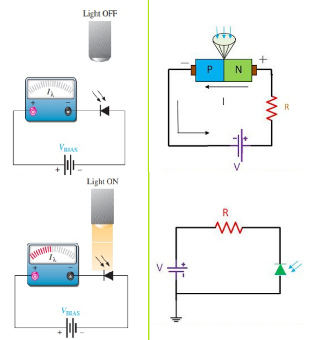 โฟโต้ไดโอด (Photo Diode) จะยอมให้กระแสไหลผ่านได้มากหรือน้อยนั้นขึ้นอยู่กับปริมาณความเข้มของแสง เมื่อโฟโต้ไดโอดได้รับไบอัสกลับ (Reverse Bias) ด้วยแรงดันค่าหนึ่งและมีแสงมาตกกระทบที่บริเวณรอยต่อ ถ้าแสงที่มาตกกระทบมีความยาวคลื่นหรือแลมด้าที่เหมาะสมจะมีกระแสไหลในวงจร โดยกระแสที่ไหลในวงจร จะแปรผกผันกับความเข้มของแสงที่มาตกกระทบ ลักษณะทั่วไปขณะไบอัสตรง (Forward Bias ) จะยังคงเหมือนกับไดโอดธรรมดาคือยอมให้กระแสไหลผ่านได้