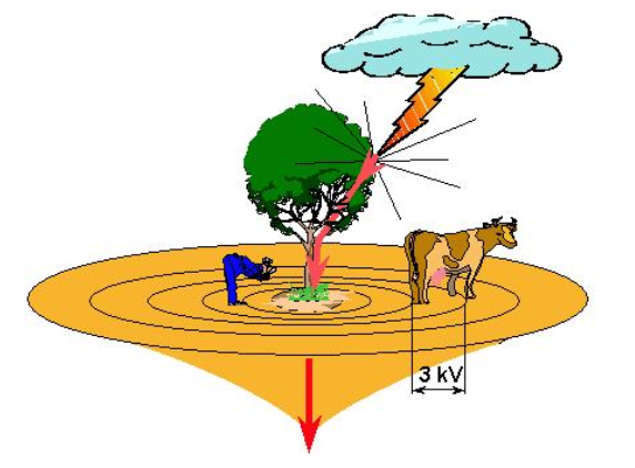 จากรูป: จะเห็นว่าเมื่อเกิดฟ้าผ่าขึ้น แรงดันหรือความต่างศักดิที่ขาวัวหน้าหลังอาจมีค่าสูงถึง 3KV. หรือ 3,000 โวลท์ ดังนั้นช่วงเวลาสั้นๆตอนฟ้าผ่าจะทำให้กระแสไฟฟ้าไหลผ่านวัวสูงและเป็นอันตรายถึงชีวิตในระยะเวลาสั้น