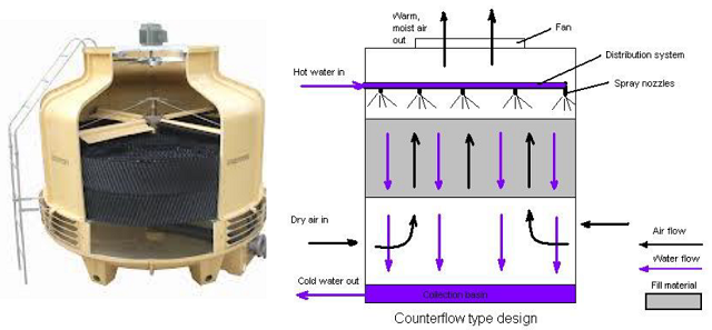 ซ้ายมือ :ตัวอย่างหอผึ่งน้้าColling Tower แบบน้้าและอากาศไหลสวนทาง(Counter Flow)