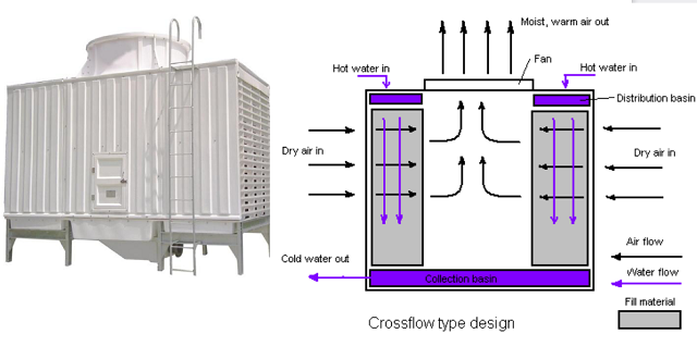 ซ้ายมือ :ตัวอย่างหอผึ่งน้้า แบบน้้าและอากาศไหลแบบตั้งฉากกัน (Cross Flow)