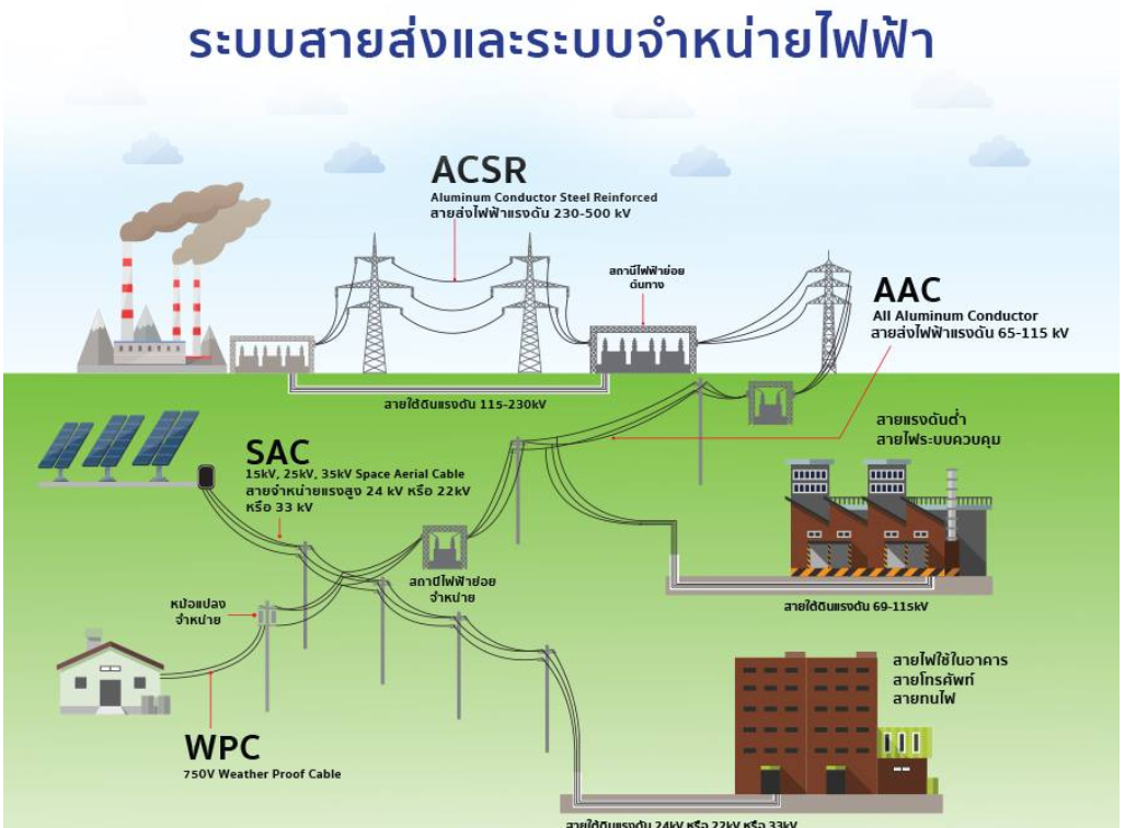 ดั้งหากพิจารณาจากสมการของกำลังไฟฟ้ากระแสสลับ P = VI cos Ø ก็จะเห็นว่าเมื่อมีการยกกระดับแรงดันให้สูงขึ้น เช่น 230 KV. (สองแสนสามหมื่นโวลท์) ซึ่งเปรียบเสมือนเป็นการส่งจ่ายในโหมดของแรงดัน ดังนั้นเมื่อพิจารณาจากปริมาณเพาเวอร์หรือ P ที่เท่าๆกันหรือใกล้เคียงกันก็จะทำให้กระแส (I) ลดลงอย่างมากและช่วยทำให้ลดการสูญเสียอันเนื่องมากจาก I2 * R ได้เป็นอย่างมากด้วยเช่นกัน