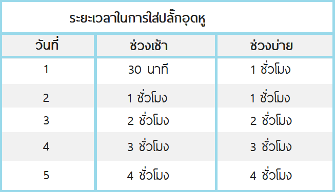 ใช้สอดเข้าไปในช่องหู โดยใช้มือด้านตรงข้ามกับหูที่จะใส่ อ้อมผ่านหลังศีรษะดึงใบหูขึ้นไปด้าน หลัง อีกมือจับปลั๊กอุดหู สอดเข้าช่องหูจนกระชับ ลึกพอสมควรระยะแรกอาจรู้สึกรำคาญ จึง ค่อย ๆ เพิ่มเวลาการใส่ ครั้งแรกใส่นาน 10-30 นาทีแล้วค่อย เพิ่มมากขึ้นตามตาราง หลัง 5 วันยังรู้สึกไม่สบาย ให้เปลี่ยนแบบใหม่