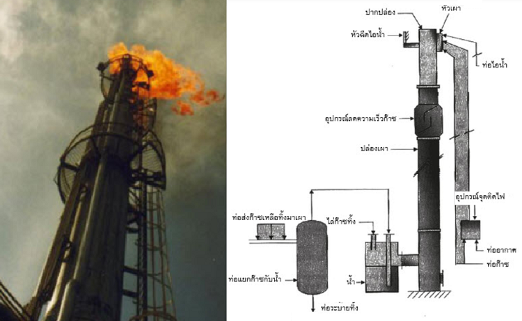 - เผาแก๊สส่วนเกินที่ถูกระบายออกมาจากการผลิต เพื่อลดความดันจากอุปกรณ์ เช่น หอกลั่น ในยามที่เกิดความผิดปกติในการเดินเครื่อง หรือ การเดินเครื่องในภาวะฉุกเฉิน