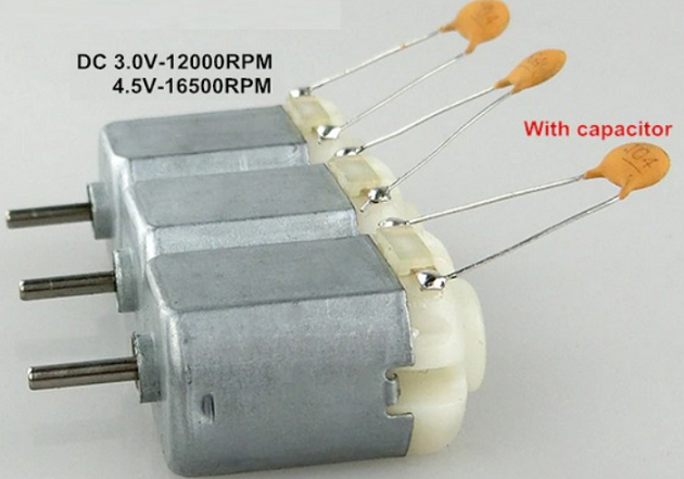 ตัวอย่าง ตัวเก็บประจุเซรามิกขนาดเล็กเชื่อมต่อขนานกับมอเตอร์กระแสตรงขนาดเล็ก