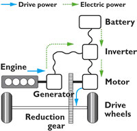 ระบบนี้เครื่องยนต์จะไปหมุนเครื่องกำเนิดไฟฟ้า หรือเจเนอเรเตอร์(Generator) เพื่อผลิตพลังงานไฟฟ้า จากนั้นพลังงานไฟฟ้าจะถูกแปลงผันอีกครั้งด้วยอินเวอร์เตอร์ (inverter) เพื่อควบคุมแรงดัน กระแส และความถี่สำหรับควบคุมการทำงานมอเตอร์ที่ทำหน้าที่ส่งกำลังไปหมุนขับเคลื่อนล้อ เพื่อให้ตอบสนองความเร็ว อัตราเร่ง และแรงบิดที่ต้องการ ลักษณะการทำงานเหมือน หัวรถจักรของรถไฟ