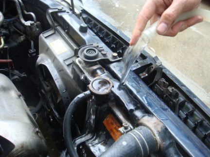 - ดับเครื่อง ปิดก๊อกน้ำ และปล่อยให้น้ำในหม้อน้ำไหลออกมาจนหมด จากนั้นปิดนัทหางปลาให้แน่น แล้วเติมน้ำเข้าไปจนได้ระดับ เติมคูลแลนท์เข้าไปด้วย ส่วนน้ำยากันสนิมจะเติมหรือไม่เติม ก็ตามแต่ใจครับ แล้วปิดฝาหม้อน้ำให้แน่น