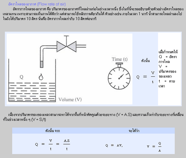 ตัวอย่าง เมื่อเราป้อนลมเข้ากระบอกสูบ เพื่อไปดันลูกสูบให้เคลื่อนที่ซึ่งลูกสูบมีหน้าตัดเท่ากับ 19.63 ตารางมิลลิเมตร และลูกสูบสามารถเคลื่อนที่ออกด้วยความเร็ว 480 มิลลิเมตร/วินาที อยากทราบว่า เราต้องป้อนลมด้วยอัตราการไหลเท่าไร วิธีทำ จาก Q = A.n