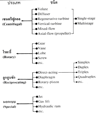 1 : ประเภทที่แยกตามลักษณะการเพิ่มพลังงานให้แก่ของเหลวหรือการไหลของของเหลวในปั๊ม ซึ่งประกอบด้วยปั๊มแบบต่างๆดังนี้
