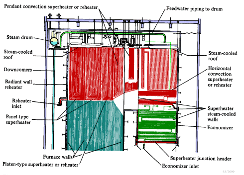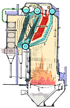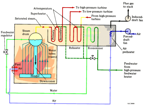 จากรูปแสดงแผนภูมิของเครื่องกำเนิดไอน้ำโดยทั่วไป น้ำที่อุณหภูมิ 450 ถึง 500 0F จากทางออกของ HP FWH เข้าที่ economizer แล้วออกในสภาพน้ำอิ่มตัวหรือ มีไอน้ำปนเล็กน้อย แล้วเข้ากลาง steam drum น้ำจาก steam drum ไหลลงทาง downcomer ที่หุ้มฉนวนอยู่ด้านนอกเตาเผาเข้าสู่ header ไหลขึ้นทาง water tubes ที่เป็นผนังเตาในตัว หรือเรียกว่า risers รับความร้อนและกลายเป็นไอบางส่วน ทำให้เกิดความหนาแน่นที่แตกต่างกัน เป็นแรงขับให้เกิดการหมุนเวียนแบบธรรมชาติ ไอน้ำถูกแยกออกจากน้ำเดือดใน drum แล้วไหลผ่าน superheater ไปเข้า HP turbine แล้วกลับมารับความร้อนเพิ่มที่ reheater ก่อนส่งไปขับ LP turbine แล้วระบายไปที่ condenser
