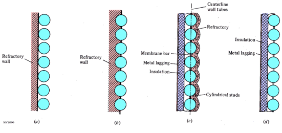 เป็นท่อน้ำหล่อเย็นผนังและรับความร้อน โดยจัดเรียงให้ชิดกันเพื่อดูดกลืนความร้อนได้มากที่สุด โครงสร้างท่อเปลี่ยนแปลงไปมากดังในรูป จากเดิมเป็น (a) ท่อเปลือย (bare) (b) ปะบนผนังทนไฟ (tangent) หรือฝังบนผนังทนไฟ (embedded) (c) ท่อพืด (studded tubes)ในที่สุดปัจจุบันเป็นแบบ (d) แผ่นเมมเบรน (membrane)