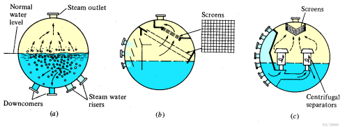 รูปแสดงการแยกตัวของไอน้ำในดรัม (a) แรงโน้มถ่วง (b) เชิงกล บานเกล็ดและตาข่าย (c) แรงหนีศูนย์กลาง